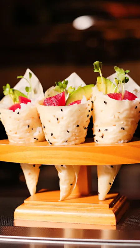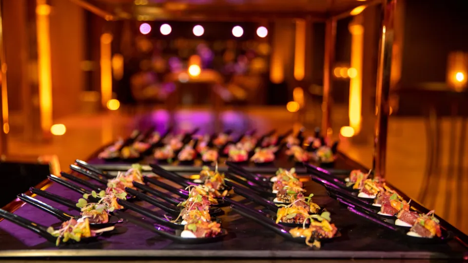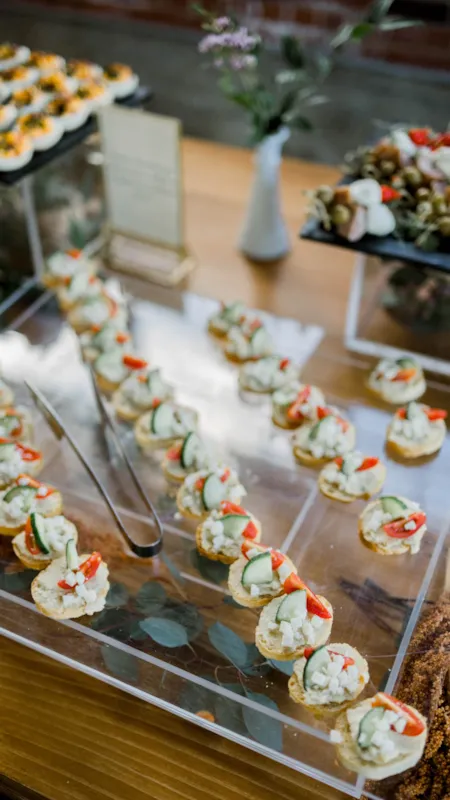 And at The Heirloom, even the food becomes part of the décor. Here, sleek black spoons cradling vibrant bite-sized ahi tuna hors d’oeuvres are artfully displayed beneath warm ambient lighting—an elevated presentation that feels as polished as the venue itself. These refined details showcase how The Heirloom transforms simple bites into show-stopping edible art.