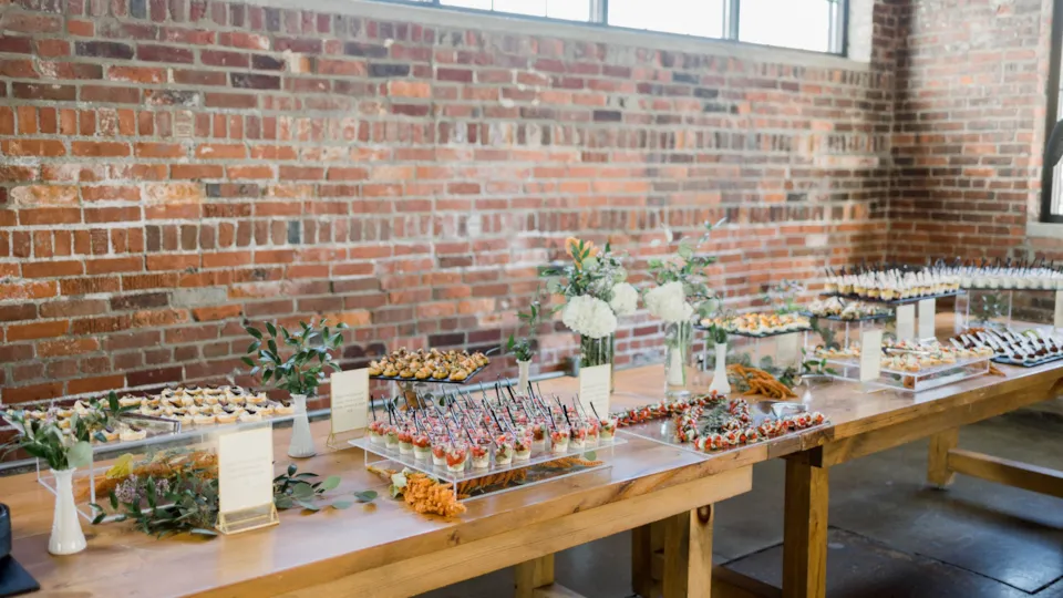 At The Crane Bay Event Center, the industrial-chic space shines as the perfect setting for creative food installations, like our fig-and-pistachio crostini served on a bed of fresh grass. This nature-inspired presentation brings a touch of earthy elegance to the sleek venue, creating a fresh and memorable experience for guests.