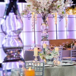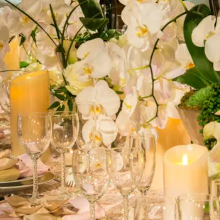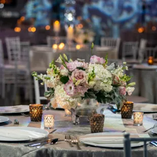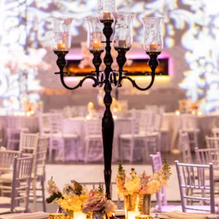 Candles are a popular, versatile, and typically less costly centerpiece option. They come in many sizes, shapes, and colors, making them a great option for any event theme. You can use them as standalone centerpieces or pair them with other decor elements like flowers, greenery, or vases. Realistic looking LED candles are very popular, safer and ensure less worry of the flame going out. If wanting to use real flame, be sure to check with the venue's policies first.