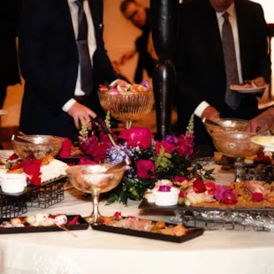 From the moment guests arrived, they were transported to a world of elegance and Greek-inspired splendor. The cocktail hour menu was a culinary delight as the aroma of freshly cooked Saganaki, a Greek dish of flaming cheese, filled the air as talented chefs prepared it right before guests' eyes. Passed hors d’oeuvres with mouth watering spanakopita and tiropita were a delightful prelude to the culinary journey that awaited.