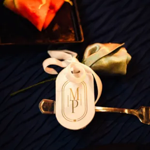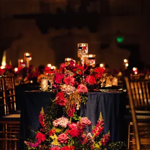 Guests dined on specialty black matte dinnerware, with each place setting featuring a magnolia leaf scripted with the guest's name, adding a personal touch to the evening. The guest dinner tables were a vision of opulence, dressed in alternating marine velvet, navy Italian crush, and Nile blue satin linens. The accompanying black satin napkins were elegantly folded in a vertical pleated band, creating a striking contrast. Gold chivari chairs with navy cushions provided comfortable and regal seating.