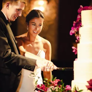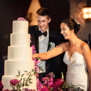 For dessert, the couple chose a masterpiece from Le Petit Gateau – a towering five-tier wedding cake adorned with cascading flowers that matched the centerpieces. Layers of perfection were served with whipped cream, fresh strawberries, and a drizzling of raspberry coulis, creating a heavenly dessert experience. Mini Greek desserts were also available, adding a touch of tradition and sweetness to the evening.