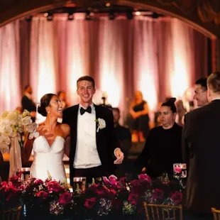 The head table was truly a sight to be seen - a custom creation, its winding shape was designed to fit 47 of their most special guests. It featured a runner of pink floral and lush greenery that ran down the middle, creating a focal point that symbolizes growth, life, and the couple's shared journey.