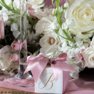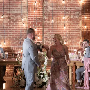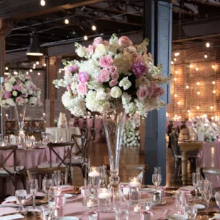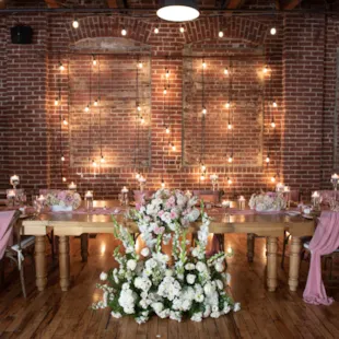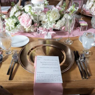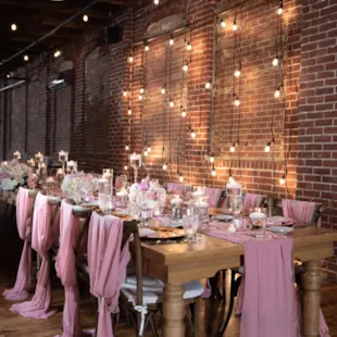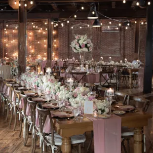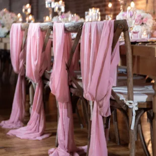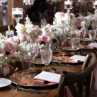Darcie Kornmeyer with Detail + Design, the talented wedding planner for this affair, brought Gianna and Nathaniel's vision to life with an enchanting decor scheme. As guests transitioned to dinner they were seated at long farm tables with blush pink runners, creating a harmonious blend of rustic and romantic aesthetics. The Heirloom's vineyard crossback chairs, with their ivory cushions, provided comfort and elegance, while the flat-folded napkins added an additional pop of pink to the tables and enhanced the overall theme. Lush pink and white floral centerpieces designed by McNamara Florist as well as scattered votives trailed down the center of the tables, creating an atmosphere of intimacy and enchantment thanks to the soft, warm light.