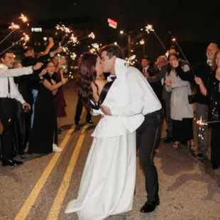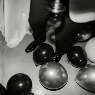 One thing we chose to do differently was to have food stations instead of a formal plated dinner. We thought this would be more fun and allow people to mingle with one another instead of remaining seated throughout the dinner portion of the wedding reception. At the end of the evening, as the balloons rained down, the couple remained on the floor to share one last private dance as newlyweds, then exited the reception as guests waved sparklers to send them on their way.