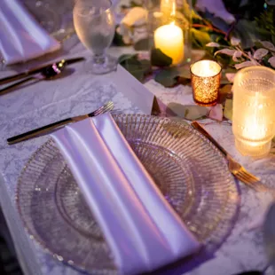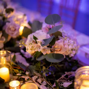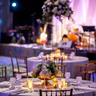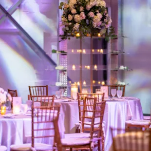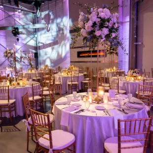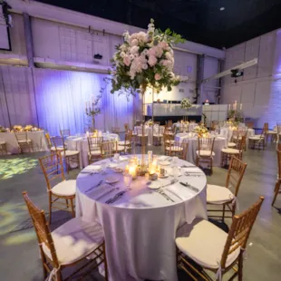 As guests transitioned to the dinner reception, they were greeted by a beautifully designed space that exuded elegance and warmth. The tablescapes featured Ivory Satin linens for the guest tables and Oyster Marble linen at the head table, complemented by ivory satin napkins and gold Chiavari chairs with ivory cushions, all provided by A Classic Party Rental. The decor, meticulously designed and arranged by Detail + Design, included votives, candelabras, and dramatic floral centerpieces in shades of white, ivory, and soft pink. A particularly striking feature was the large circular floral display suspended over the head table, adding a touch of grandeur to the setting.