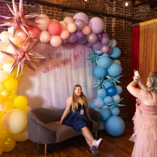 Guests walked through the “guess that song” butterfly tunnel that led to two photo ops: a cotton candy sky backdrop with rainbow balloons and a light-up marquee spelling “ERAS” with a larger-than-life glittering guitar.