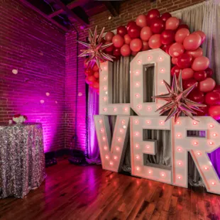 This popular lounge area featured a stunning red rose wall, heart-shaped photo booth, lush burgundy and merlot linens, red-themed charcuterie spread, and crossword challenges inspired by her lyrics "Fighting with him was like trying to solve a crossword and realizing there's no right answer."