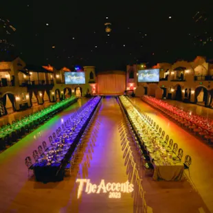 When you are thinking about a wedding or large dinner gala, banquet style seating is likely what you imagine. With round tables situated throughout an event venue, this is the perfect design for an event that will include a meal. Banquet seating can be open or assigned, and optimizes the opportunity for guests to interact.
