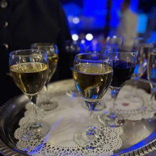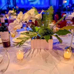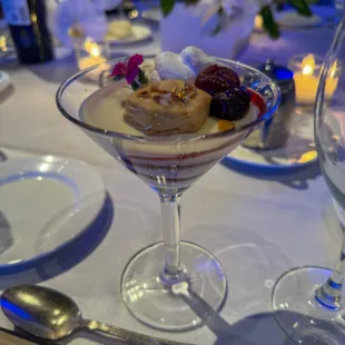 The evening began with a sophisticated cocktail reception on the ballroom's promenade, featuring butler-passed hors d'oeuvres like Mini Beef Wellingtons and Cauliflower Gnocchi with Gorgonzola Sauce and Hot Honey. Dinner followed in the grand ballroom, where our team orchestrated a dramatic salad parade featuring a Strawberry Fennel Salad with Citrus Champagne Vinaigrette. The main course included French Lemon Herb Chicken and Braised Short Rib with a Butternut Squash Soufflé and Broccolini. Dessert was a showstopper: Goat Cheese Panna Cotta with Cherry Jam, beautifully presented in martini glasses.
