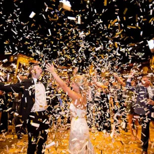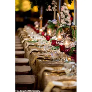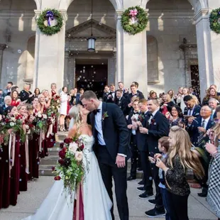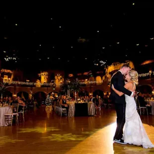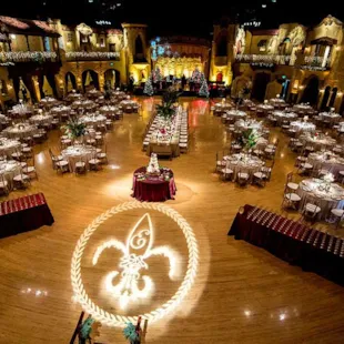Everyone was in the holiday spirit as Danielle and Joey’s late November wedding was upon us. The couple hosted their wedding reception at the Indiana Roof Ballroom in the heart of downtown Indianapolis. The couple used the grand ballroom to host all 350 of their closest family and friends.The feel in the room was very traditional and classic, using the colors of the season to personalize the decor. Autumn Keller with Isabeal Studios used lots of Evergreen, Pinecones, and deep colored florals to warm up the room. Christmas trees were scattered about the ballroom and the twinkle lights strung from the balcony gave the room that extra seasonal flair.