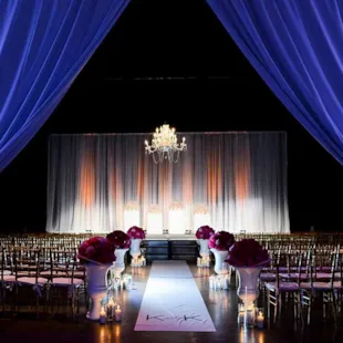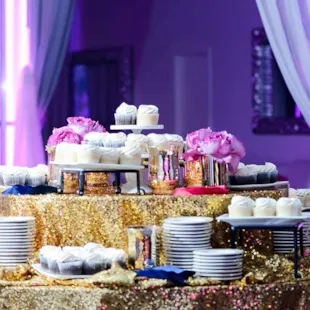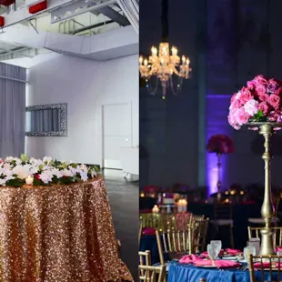 Kate Spade inspired decor, which included navy and white stripes along with fuchsia, the bride’s favorite color, radiated both urban and elegant. Garden roses, peonies, ranunculus flowers adorned the room with vibrant colors. Mixed gold centerpieces and pink uplighting set the dramatic tone for the evening. It was a spectacular event that included many wonderful touches chosen by the bride and grown that include a late night smores snack, cigar bar, a caricature artist and even a signature cocktail, “The Blushing Bride”.