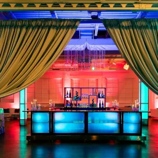 Four versatile bays, modular bars, and lounge furniture, distinctive uplighting, two patios, and a curtaining system all allow for complete customization of the space for groups from 150 to 1,500 attendees.